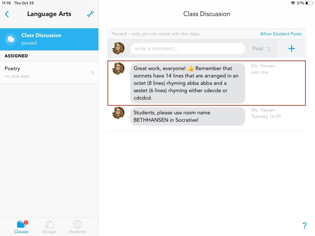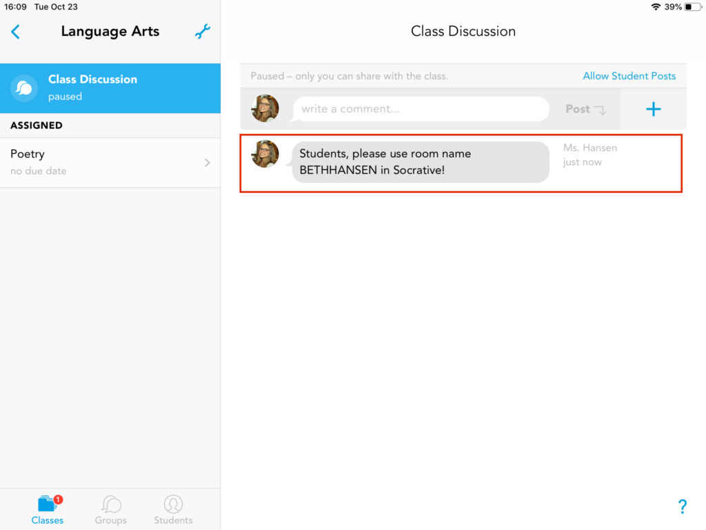 - In Showbie, post a quick explanation on question 1 in the class discussion for all students to see.