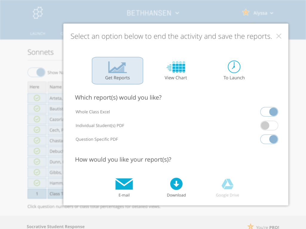 - Student-specific reports, which show how a particular student responded to each of the activity’s questions